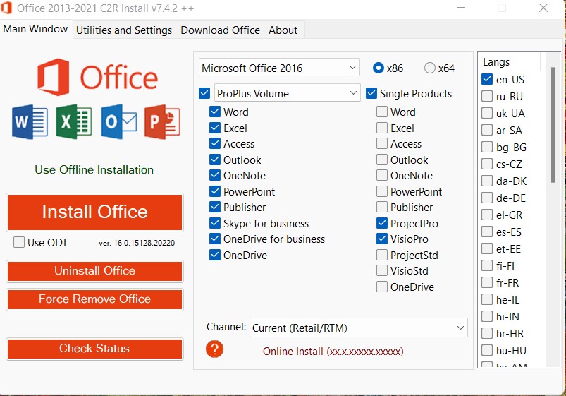 Office 2013-2021 C2R Install предназначена специально для активации офисных утилит пакета Microsoft Office, куда входят World, Excel, OneNote, Access, PowerPoint и других. Также юзеры могут без проблем выбрать любую из версий от 2013 до 2021 года.
