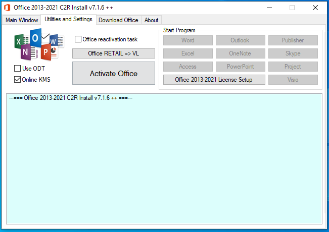 Office 2013-2021 C2R Install – самая популярная утилита с подобным функционалом, которая не просто активирует программы, а устанавливает уже взломанные версии.